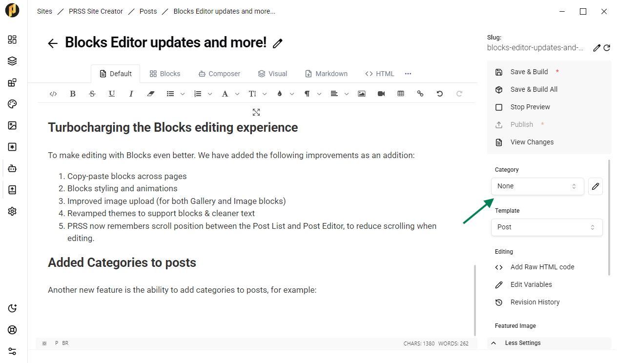 Another new feature is the ability to add categories to posts. This is available in the Post Editor.